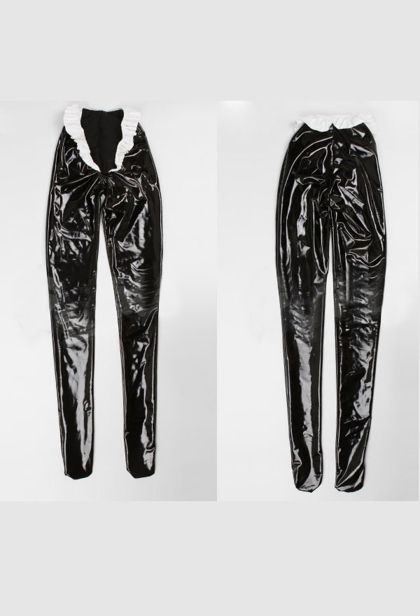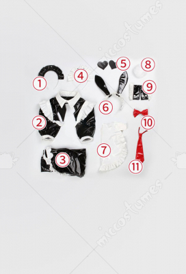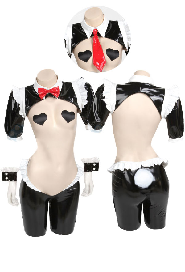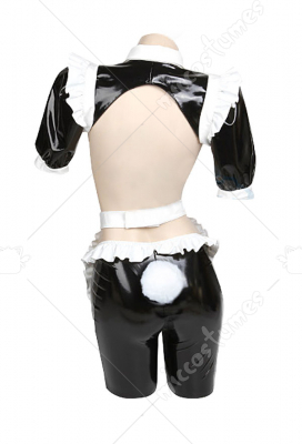 Costume Includes:black headdress,white headdress,top,pant,pasties,bunny headdress,apron,tail,wristband*2,bow,tie.Material:patent leather