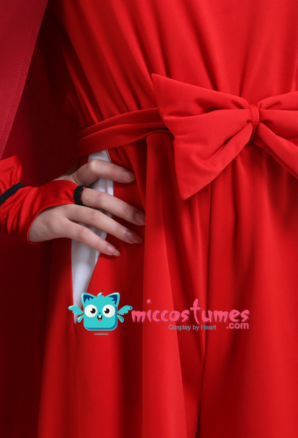 Costume Includes: cloak, jumpsuit, waist bowknot accessory*1, glove*2, leg warmer*2, hair clip*1. Material: uniform cloth, spandex. Design Details: Stitching patterns on the cloak are printed by heat-transfer printing. The jumpsuit has good elasticity and will comfortablly fit.