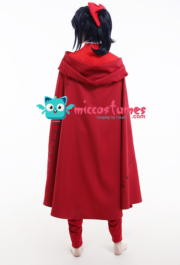 Costume Includes: cloak, jumpsuit, waist bowknot accessory*1, glove*2, leg warmer*2, hair clip*1. Material: uniform cloth, spandex. Design Details: Stitching patterns on the cloak are printed by heat-transfer printing. The jumpsuit has good elasticity and will comfortablly fit.