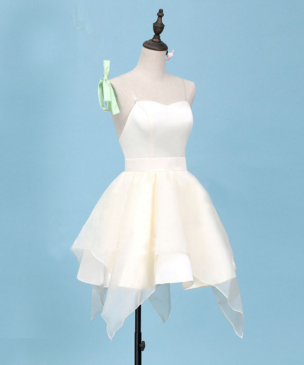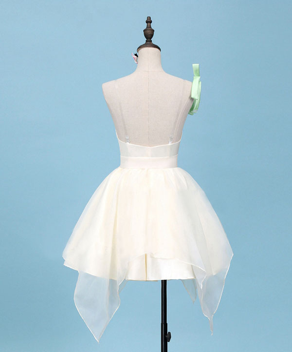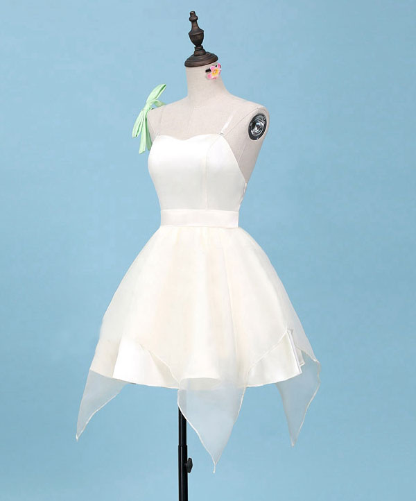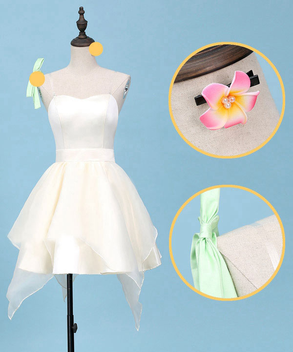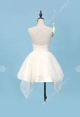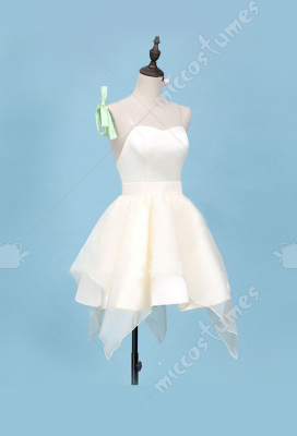 The costume includes dress, bow and hair clip. It is made of wedding satin.